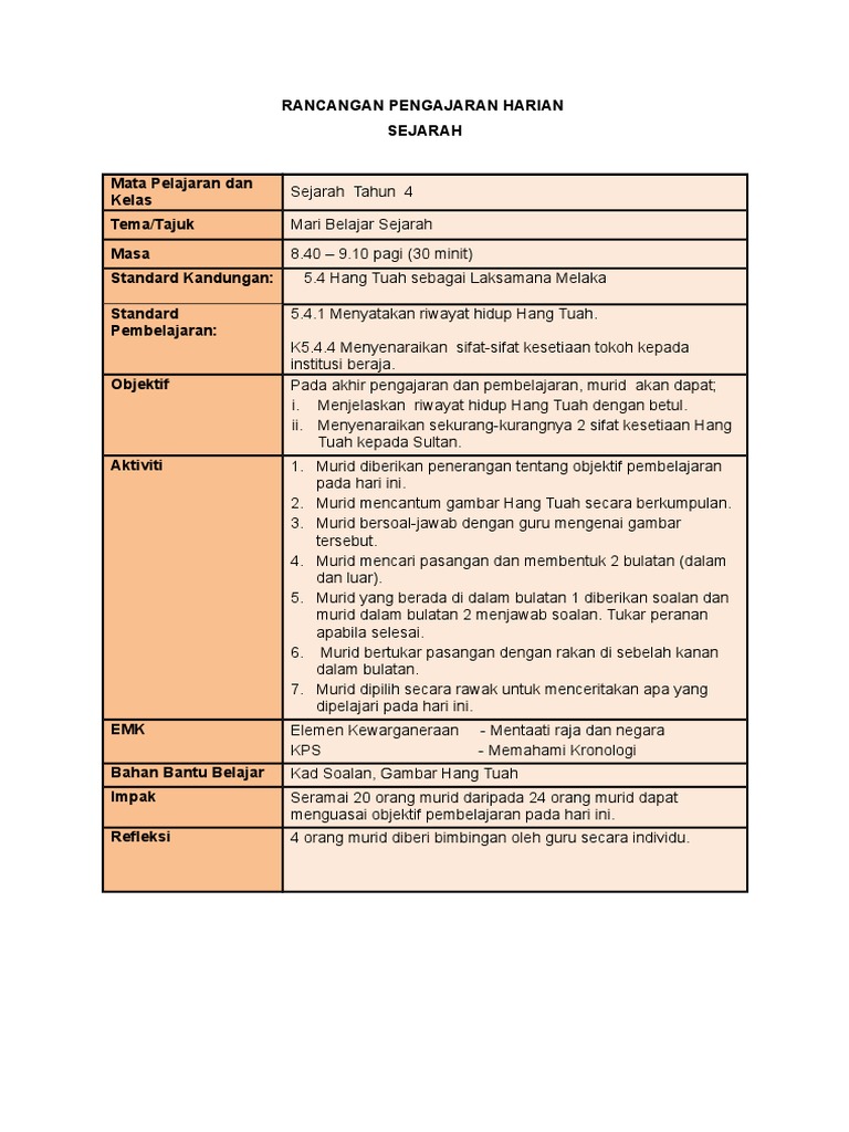 Rancangan Pengajaran Harian Tahun 4 Hang Tuah