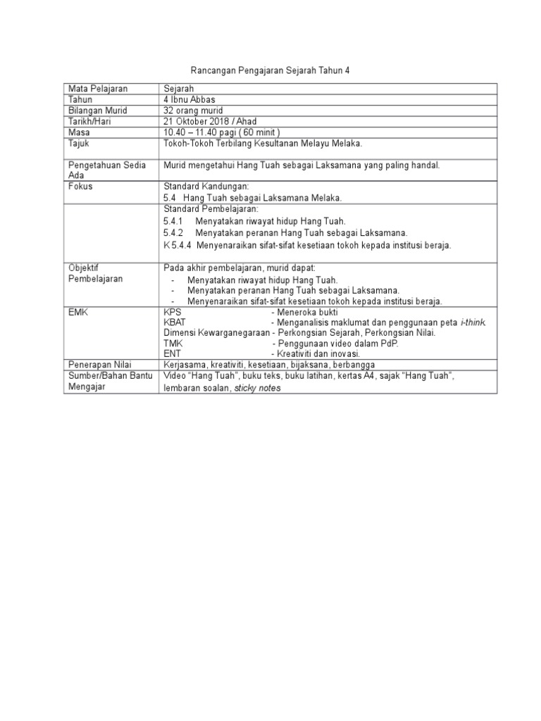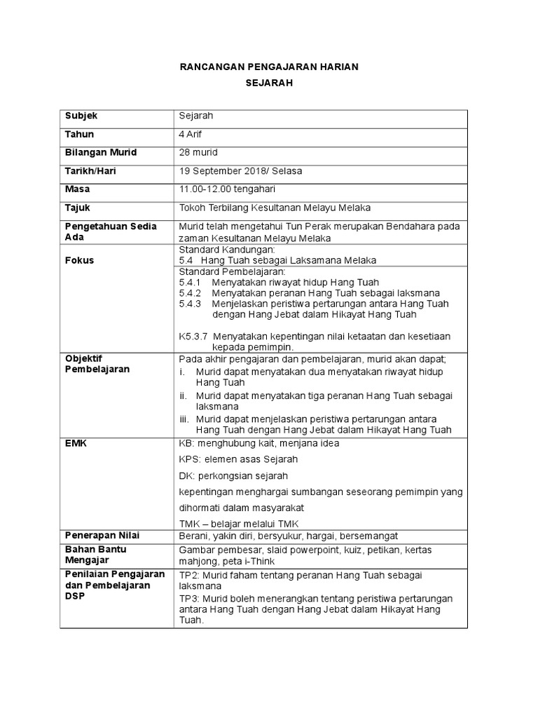 Rancangan Pengajaran Harian Tahun 4 Hang Tuah