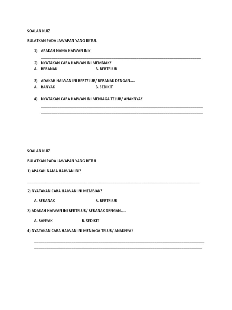 Haiwan Bertelur Banyak Bertelur Sedikit Quiz Quizizz