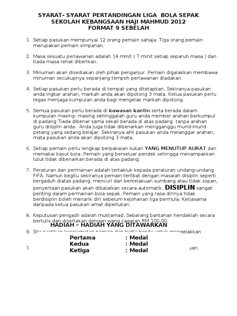 Syarat Syarat Pertandingan Liga Bola Sepak Sekolah Kebangsaan Haji Mahmud 2012 Format 9 Sebelah